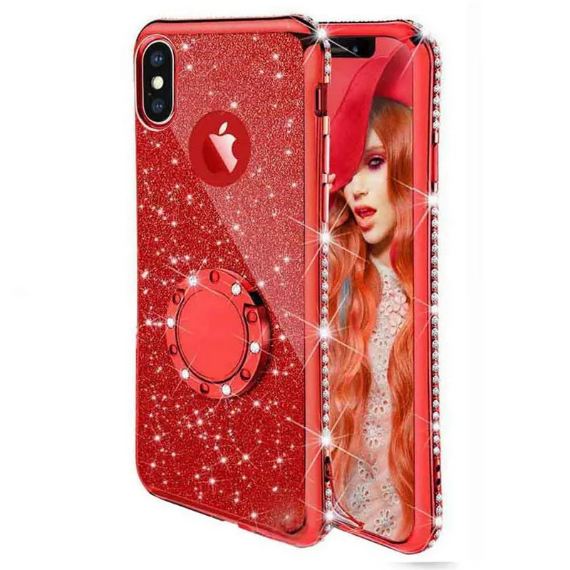 - Luxury Bling Glitter Diamond Phone Case For iPhone 13 12 11 Pro Max XR X XS Max 7 8 6 Plus SE Metal Ring Holder Soft Cover Coque