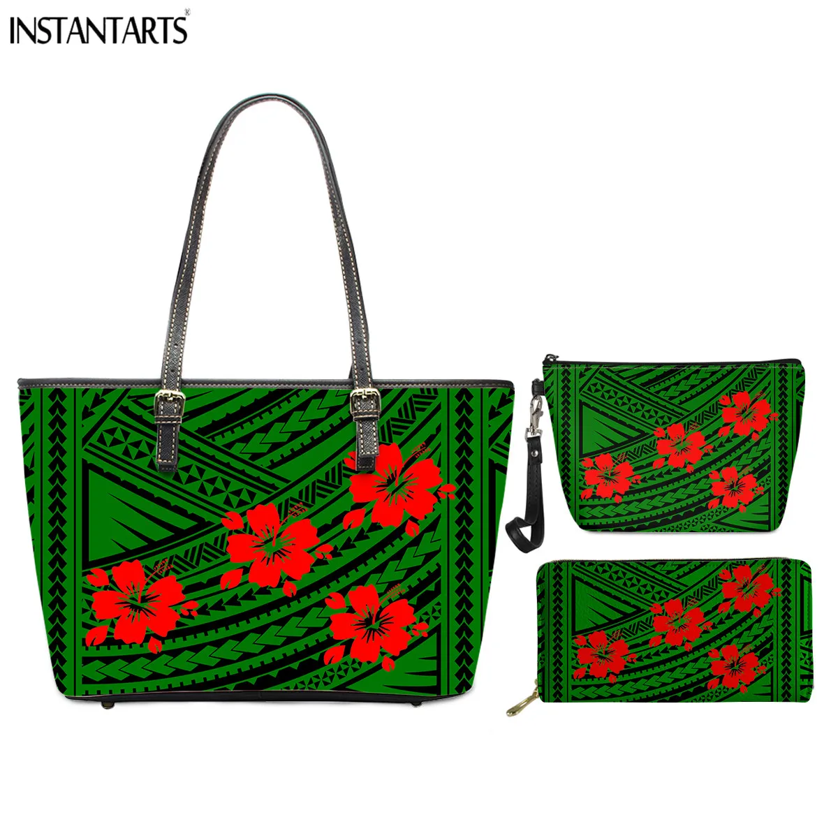 - INSTANTARTS Hawaii Tribe Ethnic Flower Print Women Large Shoulder Bags PU Leather Ladies Top-handle Bags Makeup Case Wallet 3pcs