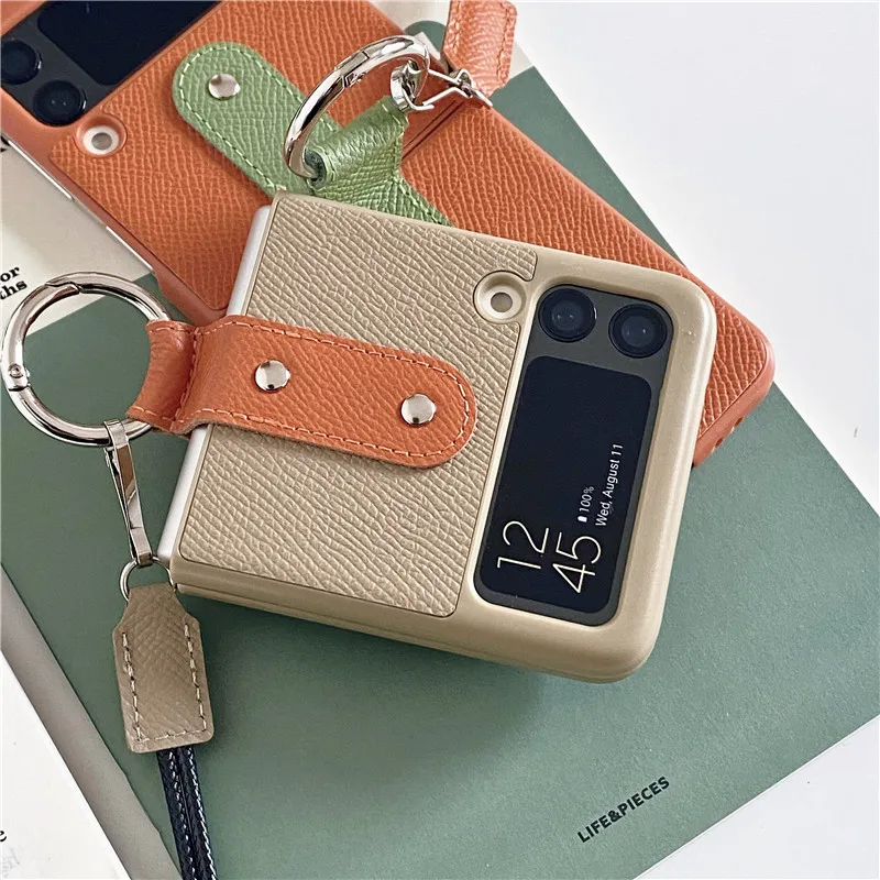 - For Samsung ZFlip3 Case Leather Phone Case for Samsung ZFlip 3 Conque Female F7110 Folding Screen Lanyard Color Matching Z Flip3